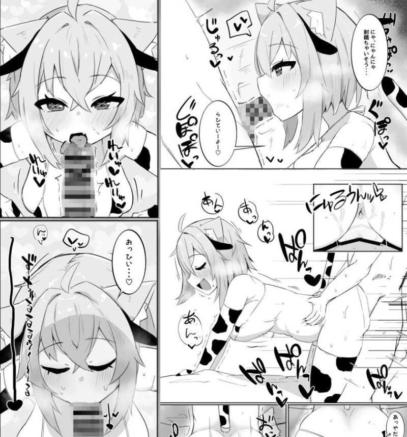 【エロ漫画/ホロライブ】猫又おかゆが牛柄ビキニ&逆バニーを着てセックス2連戦!ディープキス手コキ&フェラで1発搾り取られ!バックナマ挿入でオホ声で喘がせて中出しに!!